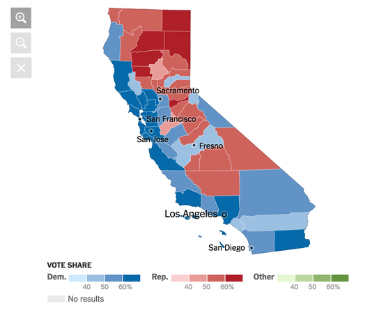 然而,這也是硅谷最不愿看到的一幕,因為特朗普對硅谷來說不啻為一個公敵。在此次大選中,特朗普在加州僅僅拿到了33%的選票,遠遠低于希拉里的61%。即便美國大部分地區(qū)都支持特朗普,加州依然是希拉里最穩(wěn)定的票倉。從選舉結(jié)果圖可以看到,在加州人口稠密的舊金山灣區(qū)(硅谷)、洛杉磯和圣地亞哥,希拉里幾乎是壓倒性的優(yōu)勢。而在硅谷的舊金山、圣馬特奧、圣克拉拉三個縣,希拉里的選票分別是特朗普的九倍、五倍和四倍。