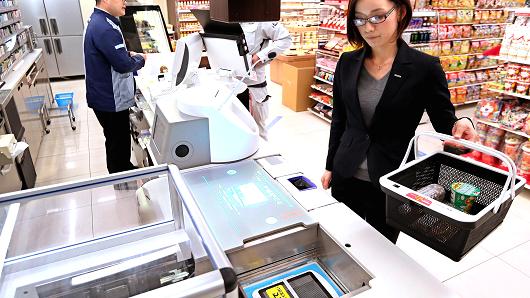 松下和羅森連鎖便利店(Lawson)日前開始測試一套機器人收銀系統(tǒng)。無需人工干預,一臺機器就能為便利店的購物者結賬,并將商品裝袋。顧客可用現(xiàn)金或銀行卡結賬。付款后,購物筐底部會自動打開,顧客購買的商品就掉到下面的包裝袋中。由松下研發(fā)的這套系統(tǒng)名為“Reji Robo”(register robots的簡稱,即結賬機器人),本周起開始在大阪的一家羅森連鎖便利店內進行測試。如果成功,羅森計劃下一財年將至少在10家連鎖便利店內部署該結賬系統(tǒng),2018年起在全國部署。