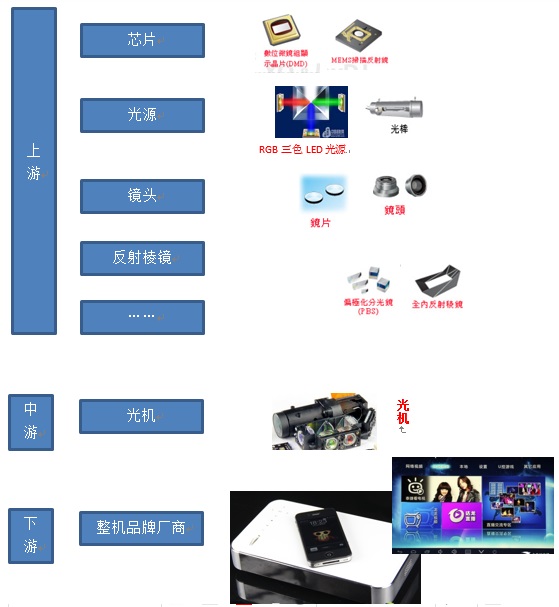 行業(yè)的技術(shù)路線決定了整個(gè)產(chǎn)業(yè)鏈的布局,投影機(jī)行業(yè)主流的技術(shù)路線有兩種:一是利用數(shù)字微反射器作為光閥成像器件的DLP技術(shù);二是通過(guò)液晶板反射成像的Lcos、3LCD等技術(shù)。目前采用DLP技術(shù)占整個(gè)市場(chǎng)的55%,其成本較其他方式較高,但顯示優(yōu)勢(shì)明顯,為未來(lái)主要發(fā)展方向。在此我們僅就微投的DLP技術(shù)路線做產(chǎn)業(yè)鏈的討論。