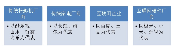 微投行業(yè)下游的參與者和潛在參與者可能會(huì)比較雜,我們先來(lái)理一下。這里僅梳理國(guó)內(nèi)廠商,因?yàn)橹T如日韓傳統(tǒng)投影機(jī)廠商,受限于政策以及基因,在內(nèi)容方面應(yīng)該是完全擠不進(jìn)國(guó)內(nèi)市場(chǎng),所以在此不做分析。