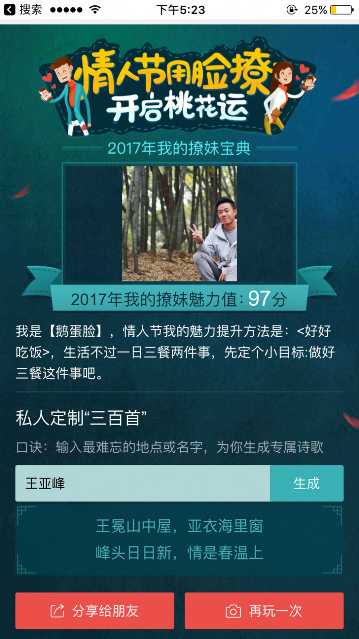 為迎接情人節(jié),百度搜索近日推出基于人工智能技術(shù)的“情人節(jié)用臉撩,開(kāi)啟桃花運(yùn)”功能。用戶在百度搜索 App 中需用語(yǔ)音說(shuō)一句“開(kāi)啟桃花運(yùn)”即可進(jìn)入主題頁(yè)面。該頁(yè)面包含兩大核心功能,一個(gè)是“自拍撩漢/妹指數(shù)”,另一個(gè)則是輸入姓名和地名自動(dòng)生成專(zhuān)屬詩(shī)歌。