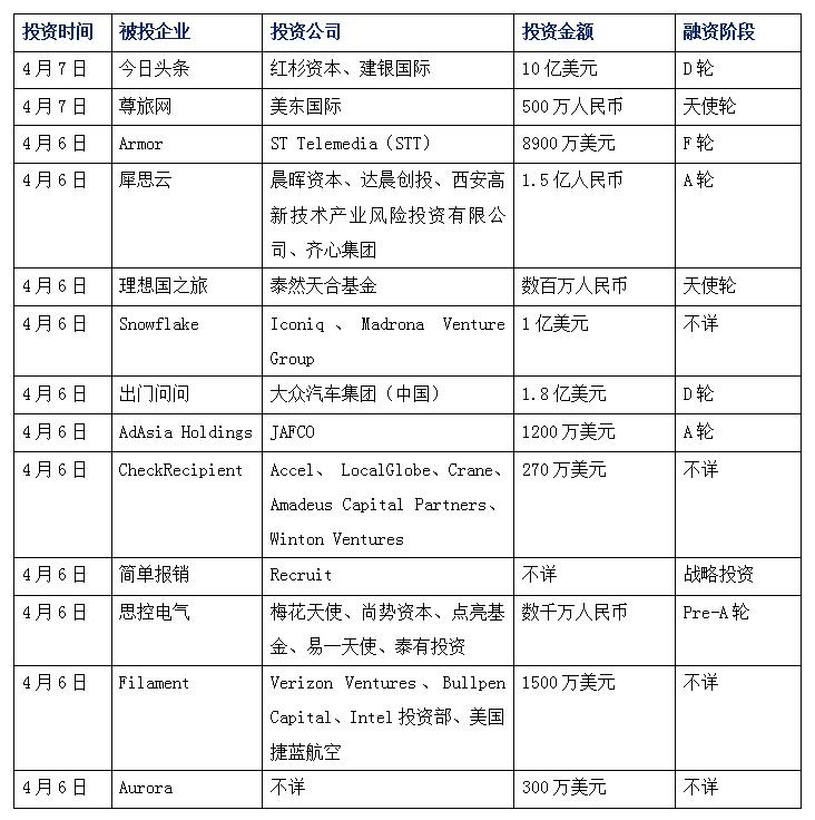 今日娛投:今日頭條獲10億美元的D輪融資;尊旅網(wǎng)獲500萬(wàn)天使融資,將開(kāi)發(fā)“住宿+旅行”市場(chǎng);CheckRecipient獲百萬(wàn)美元融資,用AI為郵箱安全提供保障