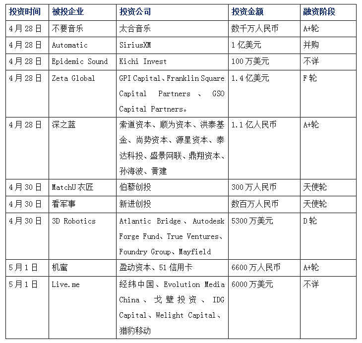 今日娛投:校園音樂(lè)網(wǎng)紅平臺(tái)“不要音樂(lè)”完成千萬(wàn)融資;水下機(jī)器人公司“深之藍(lán)”獲1.1億投資;智能手機(jī)O2O服務(wù)平臺(tái)“機(jī)蜜”獲千萬(wàn)融資
