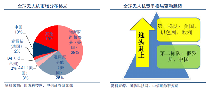 無人機(jī)作為軍機(jī)未來發(fā)展方向,各國都很重視其研發(fā)的投入。但由于技術(shù)基礎(chǔ)和經(jīng)濟(jì)基礎(chǔ)的不同,全球無人機(jī)發(fā)展情況并不均衡。目前世界無人機(jī)技術(shù)最為先進(jìn)的是美國、以色列和歐洲,處于第一梯隊(duì);而中國、俄羅斯等處于第二梯隊(duì)。近10 年中國相繼研發(fā)出各款尖端無人機(jī),目前已擁有美國所有類型的尖端無人機(jī),追趕勢頭強(qiáng)勁。