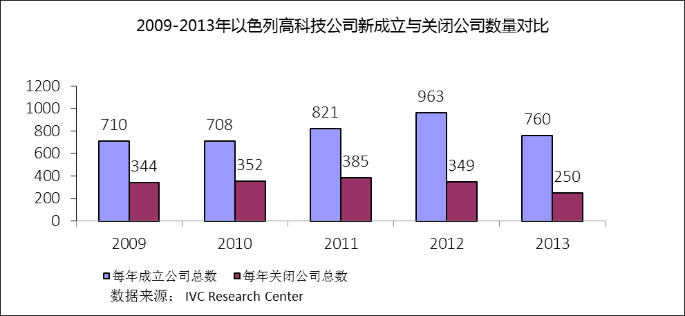 以色列“創(chuàng)業(yè)國度”的稱號(hào),大概在創(chuàng)業(yè)圈里已不是新鮮事兒了。一組直觀的數(shù)據(jù)可以更好地說明。以色列IVC研究機(jī)構(gòu)今年發(fā)布數(shù)據(jù),自2009年以來每年以色列成立的創(chuàng)業(yè)公司數(shù)量急劇上升。對(duì)于一個(gè)人口只有八百萬的國家,僅相當(dāng)于中國南京市人口,每年700多家創(chuàng)業(yè)公司成立是一件驚人的事情。與此同時(shí),以色列每年關(guān)閉的初創(chuàng)公司數(shù)量從2011年起不斷減少,更多比例的創(chuàng)業(yè)公司在茁壯成長。