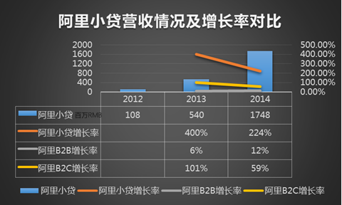 同時(shí),這部分業(yè)務(wù)處于較快的成長(zhǎng)期。數(shù)據(jù)顯示,阿里小貸業(yè)務(wù)目前處于高速增長(zhǎng)階段。2013年同比增長(zhǎng)400%,2014年同比增長(zhǎng)超過(guò)200%。更有意思的是,其增長(zhǎng)率與阿里巴巴B2C業(yè)務(wù)的增長(zhǎng)率產(chǎn)生了某種對(duì)應(yīng)關(guān)系,2013年,阿里小貸業(yè)務(wù)增長(zhǎng)率是B2C業(yè)務(wù)增長(zhǎng)率的4倍,2014年阿里小貸業(yè)務(wù)增長(zhǎng)率則是B2C業(yè)務(wù)增長(zhǎng)率的3.8倍。目前暫無(wú)法確定這一現(xiàn)象是巧合抑或真實(shí)存在這一對(duì)應(yīng)關(guān)系。如若這種對(duì)應(yīng)關(guān)系穩(wěn)定,那么B2C業(yè)務(wù)增長(zhǎng)約25%,阿里小貸業(yè)務(wù)營(yíng)收即實(shí)現(xiàn)一倍左右增長(zhǎng)。