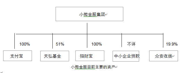 小微金服目前的主要資產(chǎn)包括了支付寶、招財(cái)寶、中小企業(yè)貸款業(yè)務(wù)、天弘基金(占股51%)、眾安在線(占股19.9%)等。