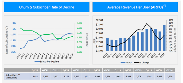 他們是怎么做到的呢?很簡單。撥號上網是一項淘汰了的技術,使用人數(shù)會越來越少,于是美國在線就不斷提高單個用戶支付的價格:2011 年是 300 萬用戶,每月 18 美元。今年剛剛過去的這個季度則是 234 萬用戶,每人每月 20 美元。