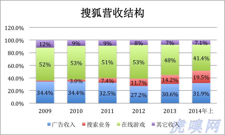 暢游早已上市,搜狗控制權(quán)即將旁落騰訊,嚴格來講,搜狐從這兩家所獲收益屬于“投資收益”而不是營業(yè)收益。2012年、2013年及2014上半年,搜狐營收中的“投資收益”保持在60%以上,已然是“半個投資公司”了。
