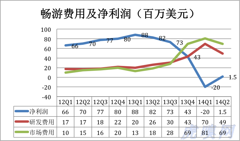 但由于市場費用、研發(fā)費用居高不下,上述三項業(yè)務(wù)最終的盈虧只在一線之間。結(jié)果是暢游盈利搜狐就盈利、暢游虧損搜狐就虧損。過往十個季度,搜狐、暢游的凈利潤走勢完全一致。