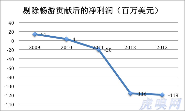 但凈利潤卻慘不忍睹!原來,不計暢游,搜狐2010年就只有400萬美元凈利潤,2012年?2013年都虧損了將近1.2億美元!(注:搜狐的并表方式是將暢游的游戲收入在Online game項下100%并入)