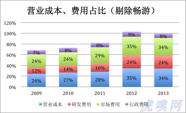 剔除暢游之后,搜狐業(yè)務(wù)主要包括三部分:門戶、搜索和視頻。參照新浪、百度和優(yōu)酷土豆的數(shù)據(jù),搜狐門戶、搜索的毛利潤率應在70%左右,而視頻業(yè)務(wù)只有30%左右。三塊業(yè)務(wù)混在一起,營業(yè)成本占營收的34%,毛利潤率66%,不算低了。