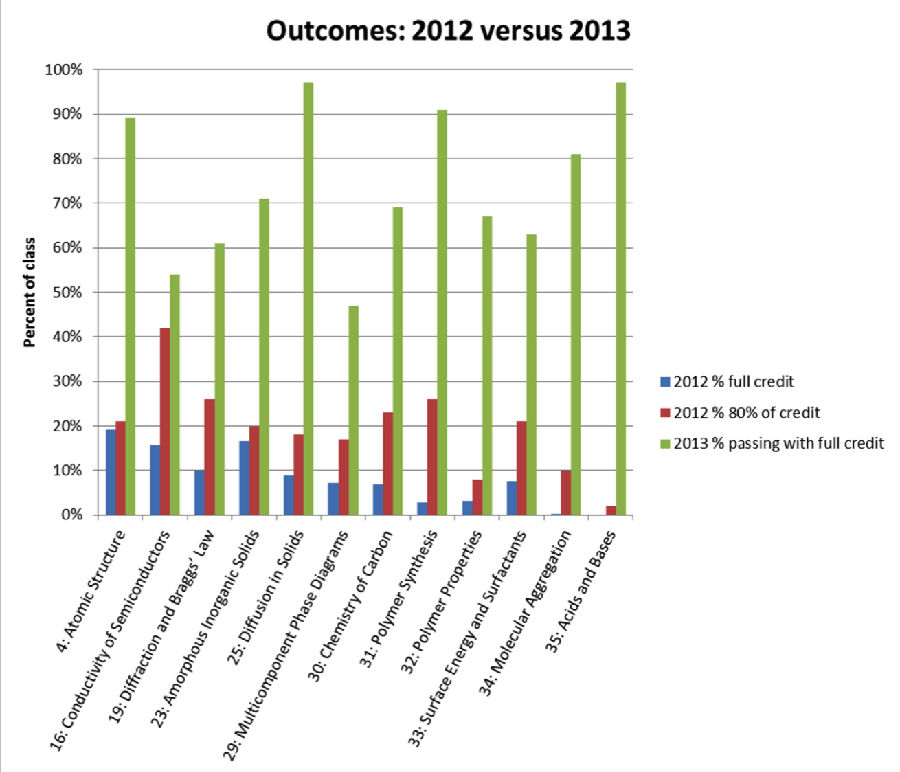 大家看一下上面這個圖,它的意思是這里有不同的學(xué)科,比如說原子結(jié)構(gòu),半導(dǎo)體的導(dǎo)電性,布拉格定率。我們看藍色和綠色,藍色是傳統(tǒng)學(xué)習(xí)方式中這些學(xué)生能夠得100分學(xué)員的比例,綠色是用這種新的教學(xué)方式去年能夠得滿分的學(xué)生的比例。
