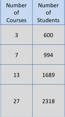 我覺得很驚奇的是,新技術(shù)采納的速度在校園是非常之快的。上圖右側(cè)數(shù)字是2014年春天的時候,左側(cè)數(shù)字是2013年,前面一列是課程的數(shù)量,后面一列是學(xué)生的數(shù)量,它成長是非??斓摹?br>
