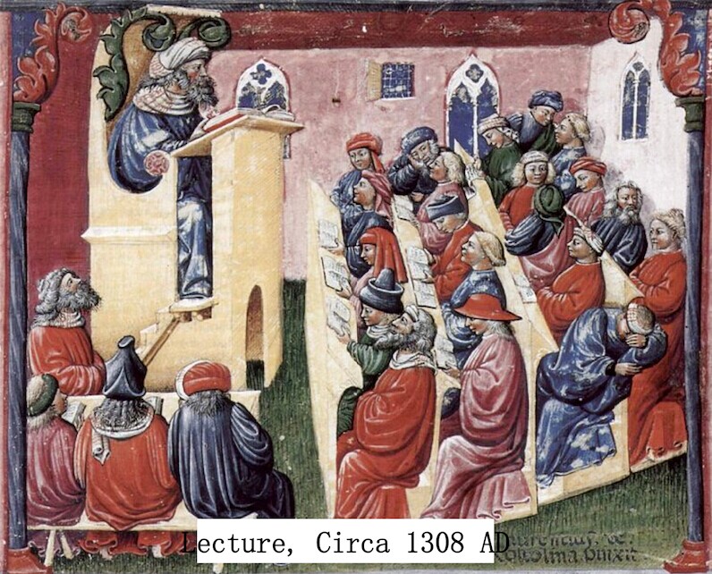 下面這張圖是Lecture,意大利的一所大學(xué),公元前1088年建立的,它并沒有很多的變化,這個講座是700年前講座的場景,大家看有什么變化嗎?我站在講臺上,你們在臺下,這種講課的模式700年來都沒有巨大的變化。
