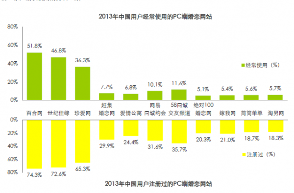 在艾瑞發(fā)布的《2013-2014年中國(guó)網(wǎng)絡(luò)婚戀行業(yè)報(bào)告》中,一項(xiàng)關(guān)于“2013年中國(guó)用戶經(jīng)常使用的PC端婚戀網(wǎng)站”數(shù)據(jù)顯示,百合網(wǎng)占51.8%,世紀(jì)佳緣、珍愛(ài)網(wǎng)和網(wǎng)易同城約會(huì)分別占46.8%、36.3%和10.1%,百合網(wǎng)在提及率、影響力、滿意度和推薦度、忠誠(chéng)度上均以居榜首。