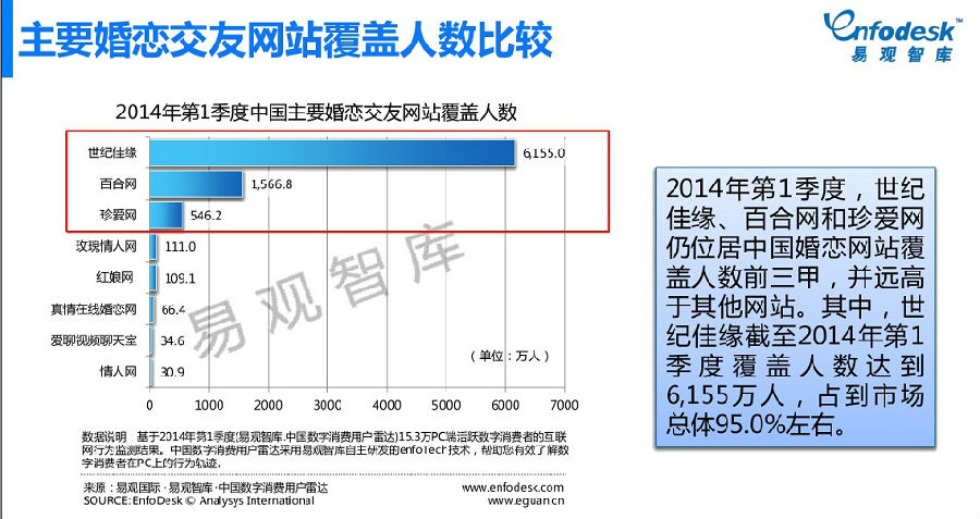 而易觀發(fā)布的《中國(guó)互聯(lián)網(wǎng)婚戀交友市場(chǎng)分析報(bào)告 2014年第1季度》則看起來(lái)是針?shù)h相對(duì),這份報(bào)告中數(shù)據(jù)顯示世紀(jì)佳緣網(wǎng)一家獨(dú)大,2014年第1季度覆蓋人數(shù)甚至占到整個(gè)市場(chǎng)份額的95%。