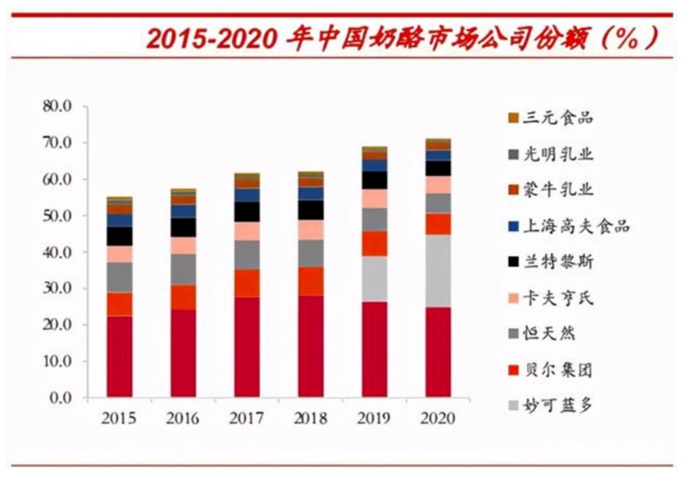 到2020年,妙可藍(lán)多市場(chǎng)份額升至第二,僅次于排名第一的百吉福,兩者共同占據(jù)了近50%的市場(chǎng)份額,行業(yè)格局開始初步形成。