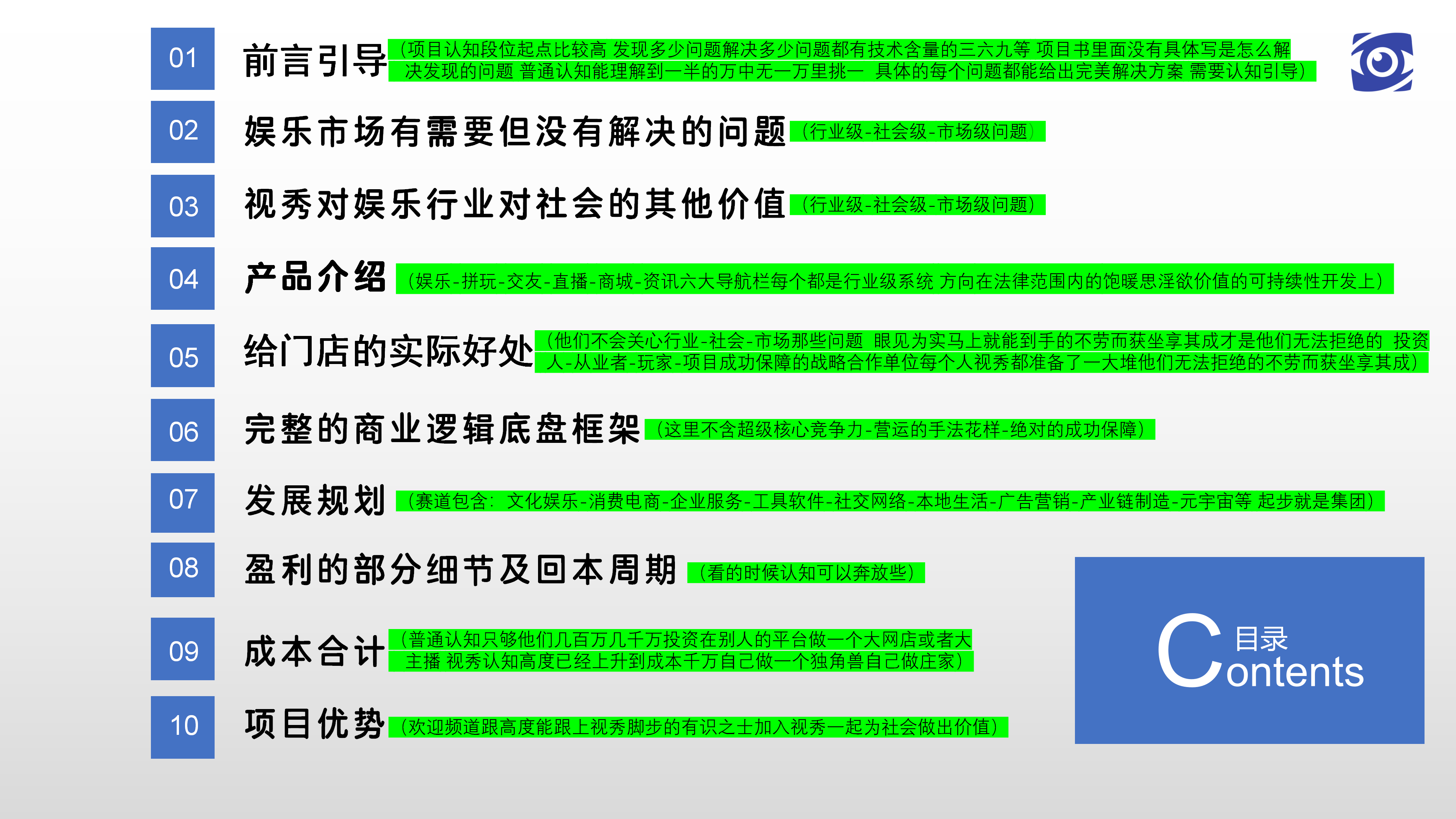市面平臺都是粘性商戶(視秀一站式解決領(lǐng)域內(nèi)商戶一切問題)跟用戶(視秀一站式解決領(lǐng)域內(nèi)用戶一切問題) 但視秀也會(huì)粘性從業(yè)者(1沖著人消費(fèi)2場所營銷3讓利及賦能高管) 成功的保障之一更是會(huì)粘性捆綁大量領(lǐng)域內(nèi)有商戶資源量的各種供應(yīng)商單位 供應(yīng)商單位除了快速大批量裂變視秀商戶 也是視秀領(lǐng)域內(nèi)免費(fèi)有價(jià)值的宣傳-對接-成交工具(避免沒用的廣告-地推-補(bǔ)貼燒錢) 項(xiàng)目書目錄第五條應(yīng)用的是前言引導(dǎo)的第二條 同樣的戰(zhàn)略合作單位創(chuàng)始人也給他們準(zhǔn)備了一堆視秀(成本忽略不計(jì))在不增加他們投資費(fèi)用跟營運(yùn)成本基礎(chǔ)之上給他們眼見為實(shí)的-馬上就能到手的-不勞而獲的-坐享其成的讓他們無法拒絕 商戶-從業(yè)者-玩家-戰(zhàn)略合作單位所能看見的利全部讓給他們 商戶-高管-戰(zhàn)略合作單位三者形成完美閉環(huán)他們自己就會(huì)瘋狂裂變海量視秀商戶 對于商戶來說視秀提供的是免費(fèi)的企業(yè)服務(wù)(收銀管理系統(tǒng)-夜場霸屏經(jīng)營系統(tǒng)-營銷系統(tǒng)) 每張消費(fèi)桌跟場內(nèi)所有屏幕上都是視秀對商戶企業(yè)服務(wù)的二維碼(類似掃碼點(diǎn)單 但視秀的聯(lián)合操作打組合拳花樣更多) 門店消費(fèi)者自己就會(huì)潛移默化成視秀的注冊用戶了