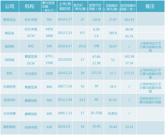 妖股唯品會是DCM另一代表項(xiàng)目。DCM當(dāng)年共投資了3900萬美元,按照6.5美元的發(fā)行價,回報達(dá)到1.6倍。而現(xiàn)在唯品會的股價達(dá)到185.9美元,如果DCM沒有退出,則回報可以達(dá)到45.76倍。