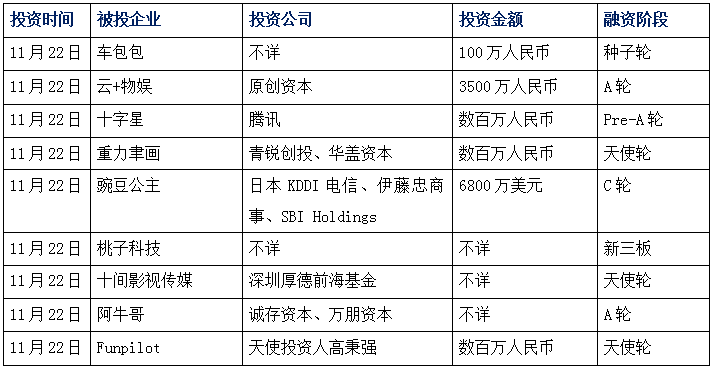 11月22日消息,綜合性娛樂公司“十間影視傳媒”宣布公司于近期已獲得天使輪融資,投資方為深圳厚德前海基金,具體金額暫未透露。