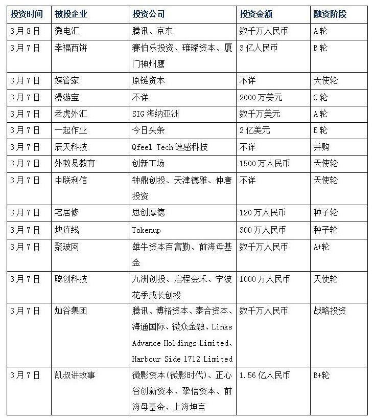 3月7日,汽車金融服務供應商“燦谷集團”宣布公司已完成新一輪融資,投資方為騰訊、博裕資本、泰合資本、海通國際、微眾金融、Harbour Side 1712 Limited、Links Advance Holdings Limited。