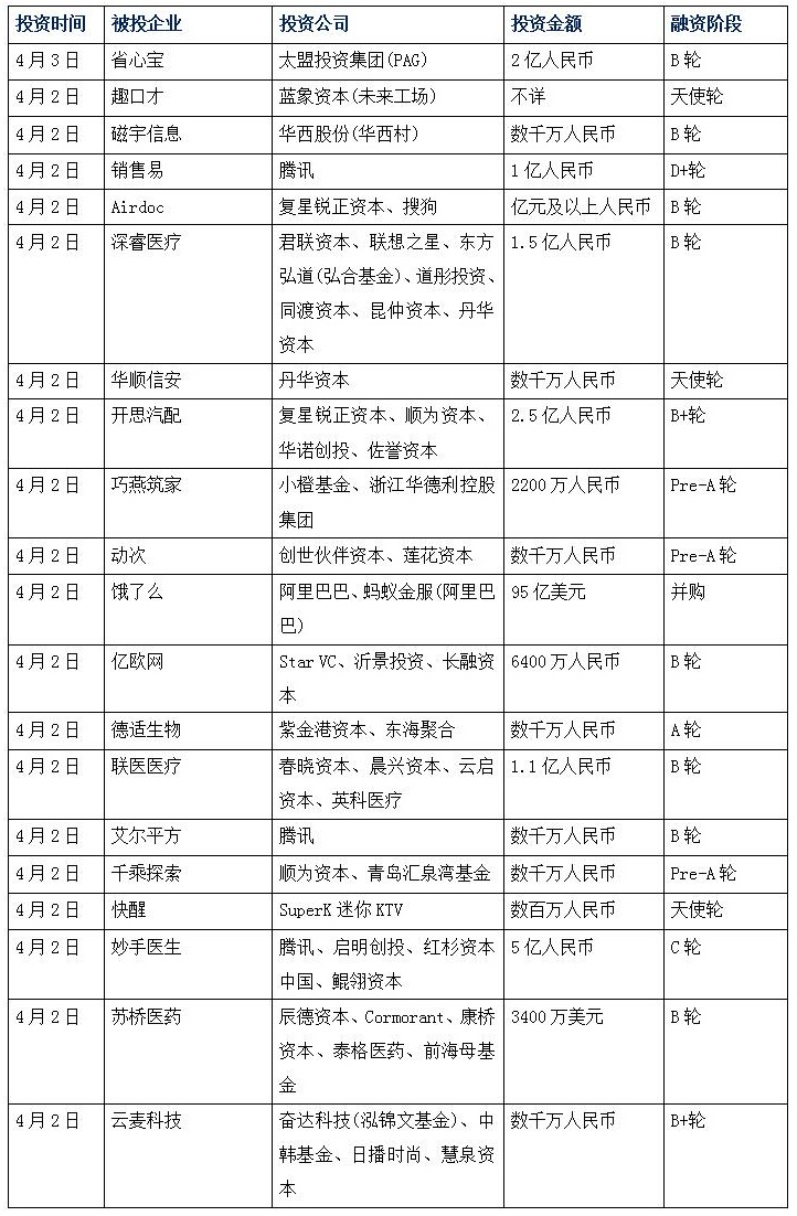 4月2日,生物藥物生產(chǎn)外包公司“蘇橋生物”宣布完成3400萬美元的B輪融資,由辰德資本領(lǐng)投,康橋資本、前海母基金、Cormorant和泰格醫(yī)藥聯(lián)合跟投。