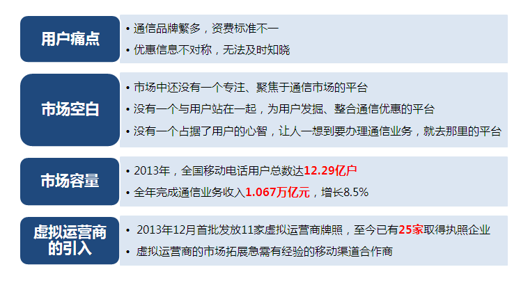 尤其是隨著移動互聯(lián)網(wǎng)的快速發(fā)展,以及虛擬運(yùn)營商的引入,我更加覺得針對移動通信行業(yè)這么龐大的一個市場,應(yīng)該有一個專業(yè)的優(yōu)惠信息服務(wù)的搜索平臺,通過這個平臺,用戶可以更加快速地搜索到自己需要的移動產(chǎn)品服務(wù),同時(shí)對于移動服務(wù)供應(yīng)商來說,也可以在同一個公開的平臺進(jìn)行競爭,最終以優(yōu)化目前移動通信行業(yè)的服務(wù)方式和布局。