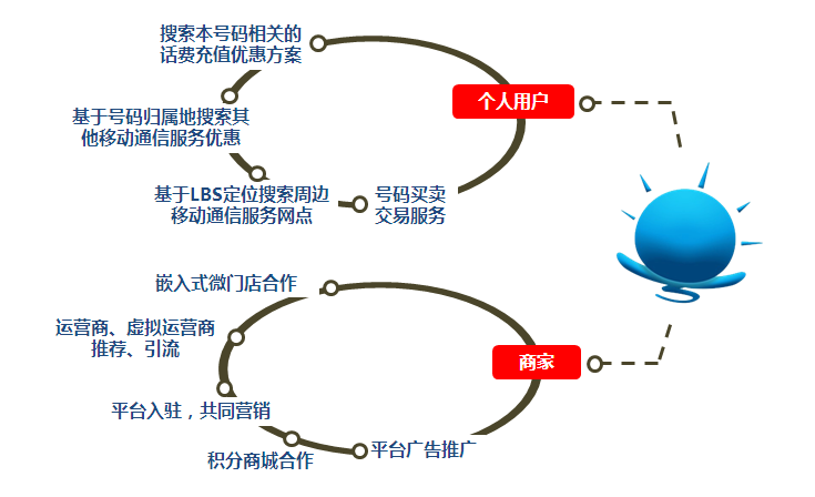 在經(jīng)過分析和思考這些標(biāo)簽之后,我慢慢地把產(chǎn)品的定位確定了下來,首先是目標(biāo)用戶的確定:即對移動通信服務(wù)有分析需求的個人用戶,以及有拓展業(yè)務(wù)服務(wù)需求的合作商家。對于他們,蚤號可以提供如下服務(wù):